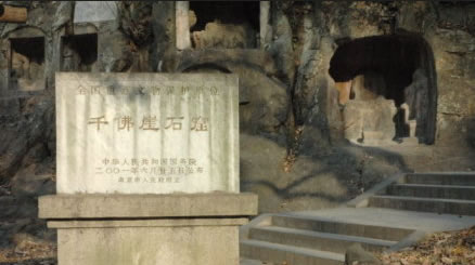 千佛崖位于禪寺院內(nèi)南側(cè),是濟(jì)南市較早的造像群,對研究我國隋代佛教,頗有價值。崖上,有隋開皇七年(587年)至開皇十五年(595年)所鐫刻的佛像,共9窟,計130多尊。極樂洞為造像群主窟,中間阿彌陀佛盤膝禪坐, 高3米,身后飾佛光。右側(cè)大勢至菩薩 ,左側(cè)觀世音菩薩侍立,高近3米,開皇十一年(591年)鑿成。其他各窟皆散落在洞外石壁上。