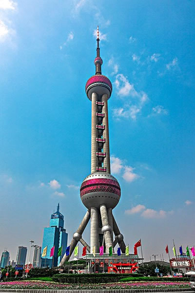 東方明珠觀廣播電視塔選用東方民族喜愛(ài)的圓體作為基本建筑線條,具有鮮明的海派建筑特色,使現(xiàn)代科技與東方文化結(jié)合統(tǒng)一;建造過(guò)程中創(chuàng)造性的使用了許多施工新工藝,如地下20米深基礎(chǔ)施工、350米高直筒體施工、93米高的斜筒體施工、豎向307米長(zhǎng)預(yù)應(yīng)力鋼絞線張拉、350米混凝土泵送、塔身垂直度偏差控制、高垂直運(yùn)輸起重、鋼結(jié)構(gòu)球體吊裝施工和450噸鋼桅桿天線就位安裝等。