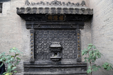 喬家大院大門坐西向東,為拱形門洞,上有高大的頂樓,頂樓正中懸掛著山西巡撫受慈禧太后面喻而贈(zèng)送的匾額,上書“福種瑯環(huán)”四個(gè)大字。黑漆大門扇上裝有一對(duì)椒圖獸街大銅環(huán),并鑲嵌著銅底板對(duì)聯(lián)一付:“子孫賢,族將大;兄弟睦,家之肥!弊掷镄虚g透露著喬在中堂主人的希望和追求,也許正是遵循這樣的治家之道,喬在中堂經(jīng)過(guò)連續(xù)幾代人的努力,達(dá)到了后來(lái)人丁興旺、家資萬(wàn)貫的輝煌。大門頂端正中嵌青石一塊,上書“古風(fēng)”。大門對(duì)面的掩壁上,刻有磚雕“百壽圖”,一字一個(gè)樣,字字有風(fēng)采。百壽圖為“在中堂”主人喬致庸的孫婿、近代著名學(xué)者、篆書家常贊春書寫。掩壁兩旁是清朝大臣左宗棠題贈(zèng)的一付意味深長(zhǎng)的篆體楹聯(lián):“損人欲以復(fù)天理,蓄道德而能文章!遍侯~是“履和”。甬道的西盡頭處是雕龍畫棟的喬氏祠堂,與大門遙相對(duì)應(yīng)。祠堂裝點(diǎn)得十分講究,三級(jí)臺(tái)階,廟宇結(jié)構(gòu),以獅子頭柱,漢白玉石雕,壽字扶欄,通天欞門木雕夾扇。出檐以四條柱子承頂,柱頭有玉樹交榮、蘭馨桂馥、藤羅繞松的鏤空木雕。額頭有匾,上書“仁周義溥”四字,李鴻章所題。祠堂里原陳列著木刻精雕的三層祖先牌位。