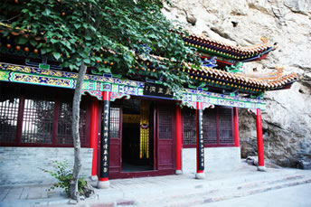 龍王洞在天竺寺景區(qū),位于石膏山上巖溶洞之東側(cè),洞高5米,寬8米,深10米許,洞內(nèi)建龍王祠。龍王祠面闊一間。洞前辟有四級(jí)平臺(tái),紅條石漫地,松柏間植,環(huán)境幽雅。洞東通一小洞,深不可測(cè),洞口壁上有赭紅字跡“龍水宮”;洞內(nèi)泉水汩汩而出,清澈異常。洞外崖壁石縫間平生一株山桃,主桿直徑不過10厘米,貼地生出百十根分枝,呈扇面狀!吧让妗庇3米多長(zhǎng)、2米多寬。每逢陽(yáng)春三月,滿樹桃花盛開,有如鳳凰展翅。這就是石膏山古景之一的“龍鳳呈祥”。 |
