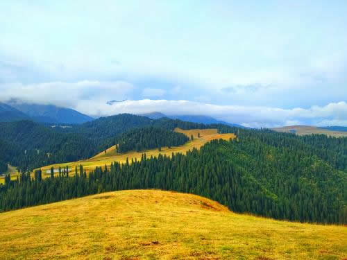 夏季,在每年的6、7月份是避暑消夏的季節(jié)。初到這里的人,會錯覺以為到了瑞士:沒膝的黨生花、貝母花和一種叫不上名的小黃花漫山遍野,就像神仙種植的一樣,在草地里自然生長為好幾層。爭奇斗妍,沁人心脾的花香令人陶醉;遠處群山起伏,層巒疊嶂,連綿不斷,蒼松翠柏直插云霄,雪峰、林海和綠草鮮花構(gòu)成了一副秀麗的山水畫卷;行走在這綠茸茸、濕漉漉的草地上,涼風習習,盡情呼吸新鮮的空氣和花草的芳香,一種心靈被大自然凈化的感覺油然而生。再往里面走就是雪山,皚皚的積雪終年不化。騎馬可以到達雪山腳下,那里溫度急劇下降,剛才還是短褲T恤,就得穿上厚棉衣。身上還是烈日曬著,頭頂一朵云飄過,很可能就是一陣瓢潑大雨,讓你看著太陽卻渾身濕透。過一會雨停了,山風已不知不覺吹干了你的衣服。