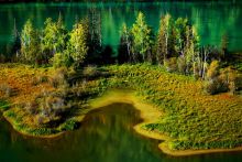 變色湖位于喀納斯湖中央。春夏時(shí)節(jié),湖水會(huì)隨著季節(jié)和天氣的變化而變換顏色。從每年的四五月間開(kāi)化到11月冰雪封湖,湖水在不同的季節(jié)呈現(xiàn)出不同的色彩。5月的湖水,冰雪消融,湖水幽暗,呈青灰色;到了6月,湖水隨周山的植物泛綠,呈淺綠或碧藍(lán)色;7月以后為洪水期,上游白湖的白色湖水大量補(bǔ)給,由碧綠色變成微帶藍(lán)綠的乳白色;到了8月湖水受降雨的影響,呈現(xiàn)出墨綠色;進(jìn)入9、10月,湖水的補(bǔ)給明顯減少,周圍的植物色彩斑斕,一池翡翠色的湖水光彩奪目。