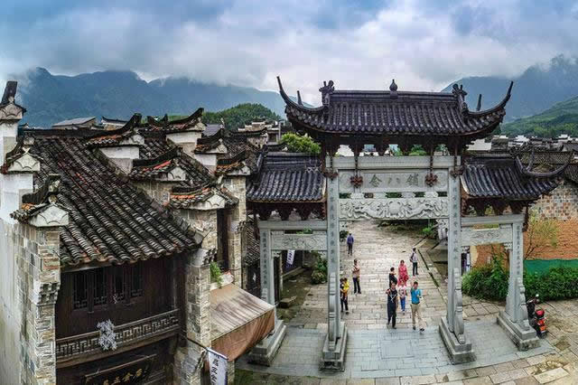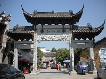 古鎮(zhèn)的大戶有曹、姜、楊、金四家。他們圍繞著宗族而居,至今還保留著36幢完整的古民居大院。站在老街上,最富有特色的是家家戶戶的門楣。門楣多為樓閣式,由梁、枋、檐、望板和垂簾虛柱構(gòu)成四柱三樓式。各個部件都有精細(xì)的木雕裝飾,題材多為福祿壽、合和二仙等吉祥物。這木制的門楣和江南其他地區(qū)的磚雕門樓有著截然的反差,使人走在這老街之上,無不被這景色所吸引?催@徽式的馬頭墻、浙式的屋脊、贛式的檐櫞、閩式的土墻,其內(nèi)涵的豐富已足以使建筑學(xué)家所驚嘆。