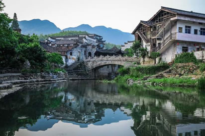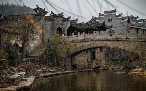 小橋如虹霓跨溪,上面長滿了綠藤,橋下水聲依依,站在不遠(yuǎn)處的水埠上,半圓的橋拱與水中的倒影正好構(gòu)成了一個圓,水波蕩漾,恍如一輪圓月,此景被叫做“楓溪望月”確是名不虛傳。