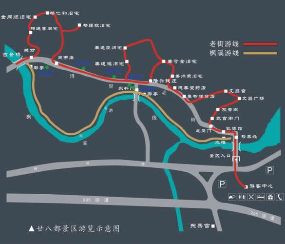 古鎮(zhèn)舊有東西南北四道城門,今唯有鎮(zhèn)南石質(zhì)門額一方,書有“楓溪鎖鑰”。一條街道與小溪并行,自北至南曲折蜿蜒長達(dá)1公里。兩旁多為二層樓店鋪作坊,基本保持了19世紀(jì)集鎮(zhèn)的風(fēng)貌。