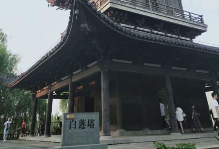 白蓮塔位于西柵大運(yùn)河畔的環(huán)河島上,白蓮塔高有七級(jí),塔高約51米,為烏鎮(zhèn)最高建筑,塔下有八角形的升蓮廣場,廣場中有放生池,東側(cè)河岸邊有一條石舫。白蓮塔屬于宋元時(shí)期江浙一帶通行的磚木混合結(jié)構(gòu)的閣式塔,縱觀其塔,外觀呈梭狀,實(shí)際上塔的平面是呈正方形的,塔基也是一個(gè)24米乘24米的正方形,內(nèi)部地面用清水方磚鋪就而成。